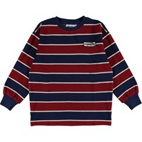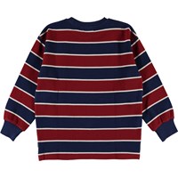 Monau är en randig sweatshirt med breda ränder i färgerna bordeaux och blå, samt smala vita ränder i mellan. På tröjan vänstra sida är trycket ‘Equality’ påsytt.