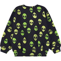 Svart sweatshirt i mjuk ekologisk bomull med en utomjording. Sweatshirten har ribbade kanter runt halsen, ärmsluten och midjan, samt en lös passform.