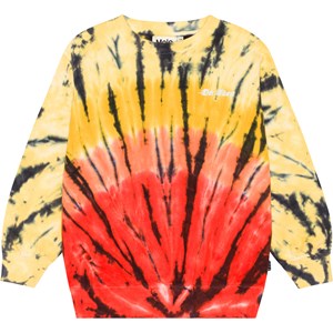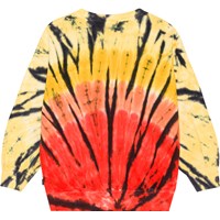 Ekologisk sweatshirt med tie-dye mönster i röd, gul, orange och svart. Tröjan har en lös passform, rund hals med ribbkant och ribbkant vid handleder och höfter. Notera att allt vårt tie-dye är handgjort och kan därför variera från plagg till plagg.