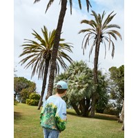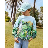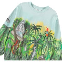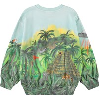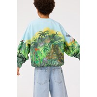 Ljusblå sweatshirt i mjuk ekologisk bomull med ribbade kanter vid halsen, ärmsluten och nederkanten. Sweatshirten har en lös passform med ett mönster av utomjordingar och UFO:n som har landat i den gröna djungeln.