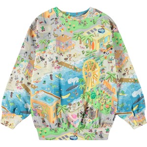 Mångfärgad sweatshirt i mjuk ekologisk bomull med ribbade kanter vid halsen, ärmsluten och nederkanten. Tröjan har en lös passform med ett pixlat mönster av den verkliga världen, roliga karaktärer från Molos kollektioner och massor av spännande berättelser som är roliga att utforska i det färgglada universumet.
