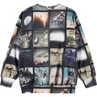Multifärgad sweatshirt i ekologisk bomull med en borstad insida, vilket gör den mjuk och varm att ha på. Tröjan har en lös passform, rund hals och ribbade kanter. Det övergripande trycket består av en serie skärmar med olika bilder, några teknologiska och några naturliga, som påminner oss om att vi alla är här tillsammans. Skärmarna flimrar lite, vilket ger bilderna en cool sci-fi-effekt.