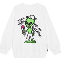 Vit ekologisk sweatshirt med mönster framtill. Här ser du en grafittisprayad, mycjet nöjd, alien-turist, som har fått vad han kom efter - nämligen glass! Tröjan har en lös passform, rund hals med ribbkant och ribbkant vid ärmslut och höfter.