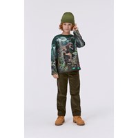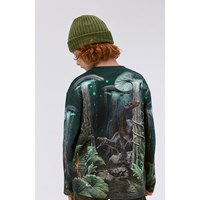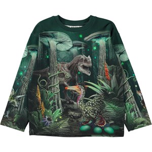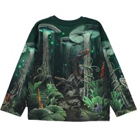 Grön sweatshirt med dinosauriemönster. Här ses otroliga skapelser från en fjärran forntid vandra runt i en magisk skog. Gigantiska bioluminescenta svampträd och eldflugor lyser upp scenariot. En färgrik fågelaktig dinosaurie vaktar sina smaragdgröna ägg, medan andra dinosaurier lurar runt i bakgrunden medan de letar efter mat. Denna tröja är tillverkad i 100% bomull, har rund hals med ribbkant, ribbkanter vid höfter och ärmar samt en normal passform.