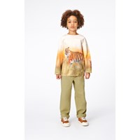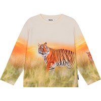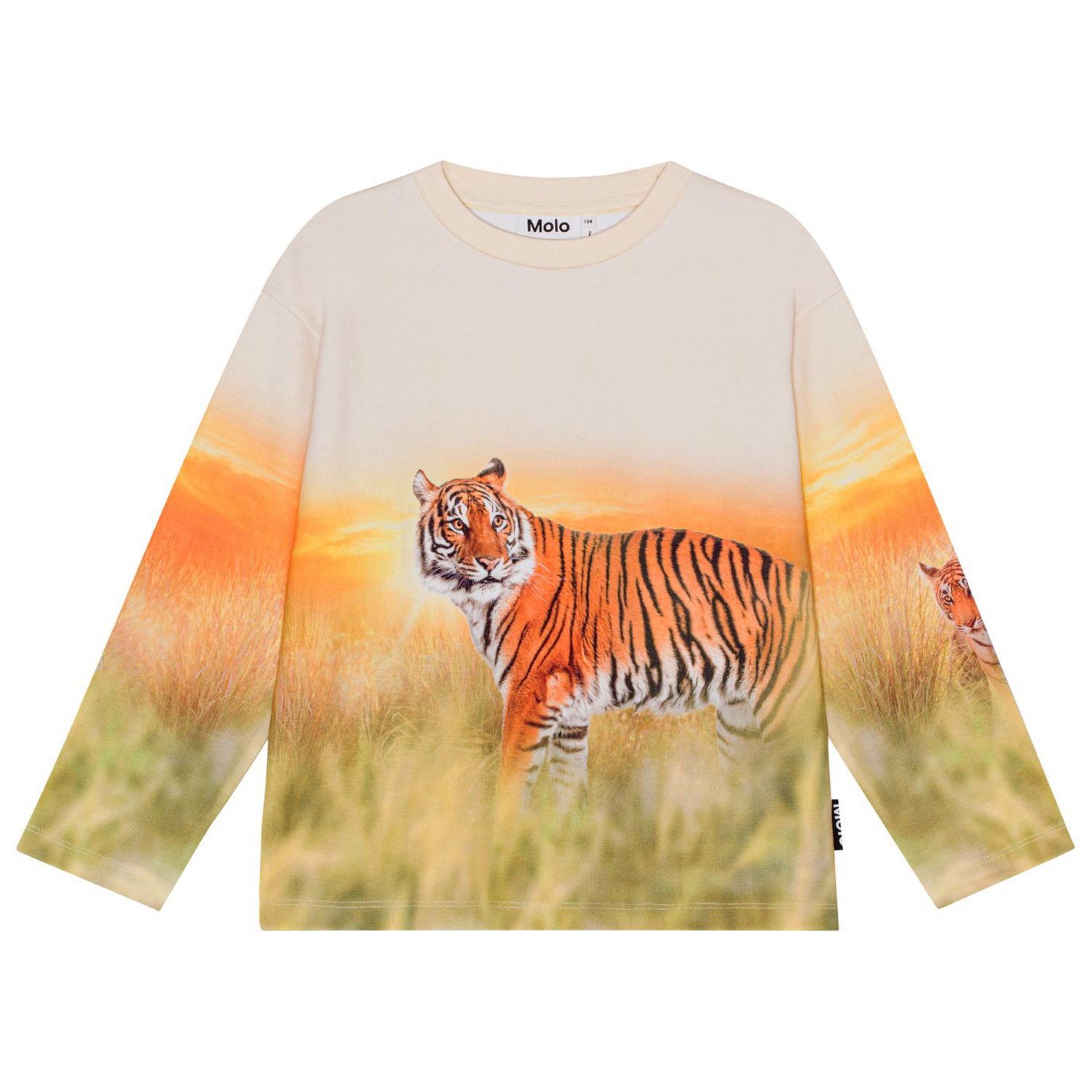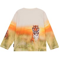Mountoo är en sweatshirt med mönster i orange och gröna nyanser, i 100% ekologisk bomull. Här ses en tiger som går omkring i det höga gräset och kanske letar han efter sina vänner. Han tittar sig i alla fall över axeln, kanske får han syn på tigern på ärmen, eller kanske den på ryggen? Tröjan har rund hals med ribbkant, långa ärmar och en normal passform.