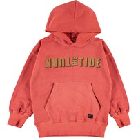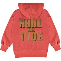 Moz är en röd hoodie med en tvättad look. Moz har en känguruficka framtill och tryck med texten "Turn the Tide".