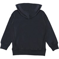 Moz är en mörkblå huvtröja med en känguruficka framtill och en molo-logotyp på bröstet.