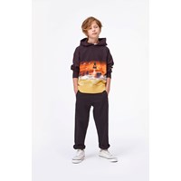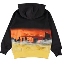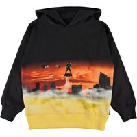 Mozzy är en svart hoodie med gul botten och ett tryck av framtiden på framsidan, där en man svävar över staden.
