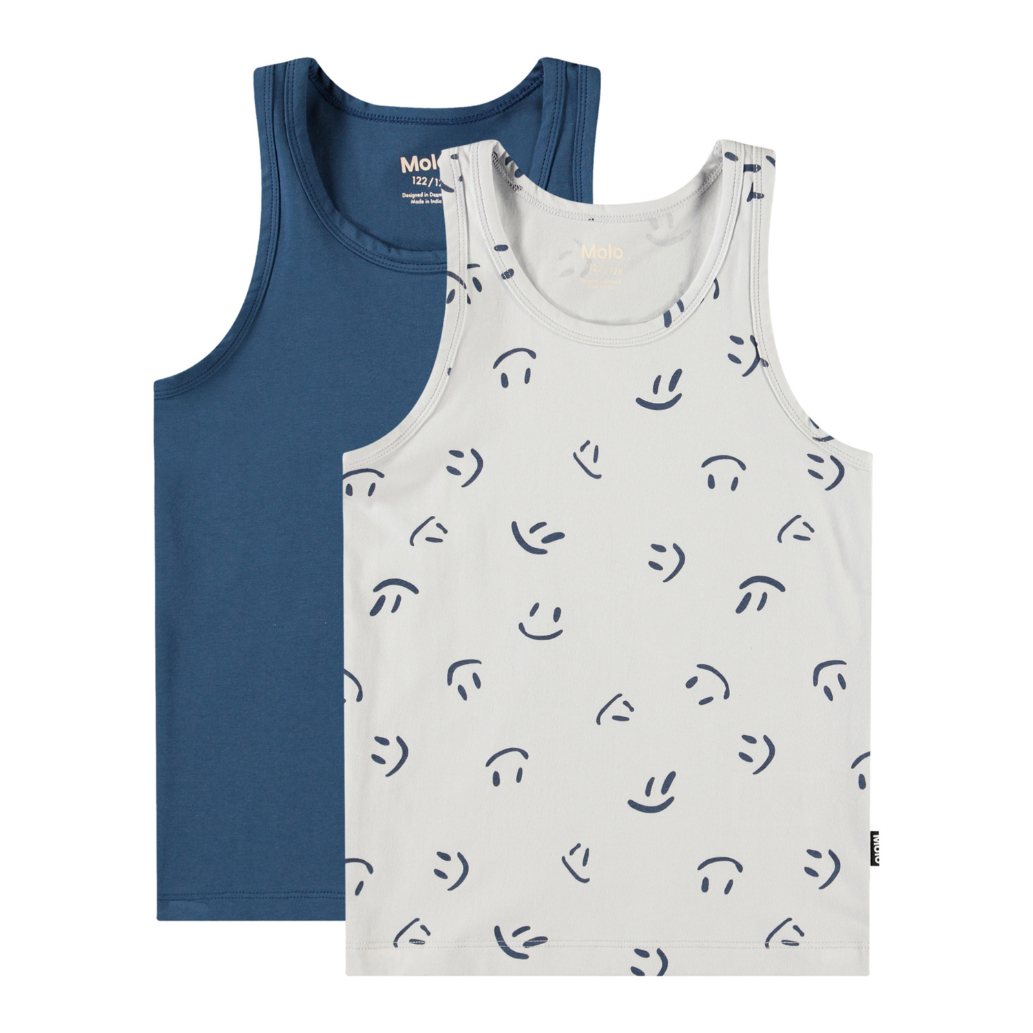 2-pack linnen i mjuk ekologisk bomull. Paketet inkluderar ett mörkblått linne och ett vitt med smileys.
