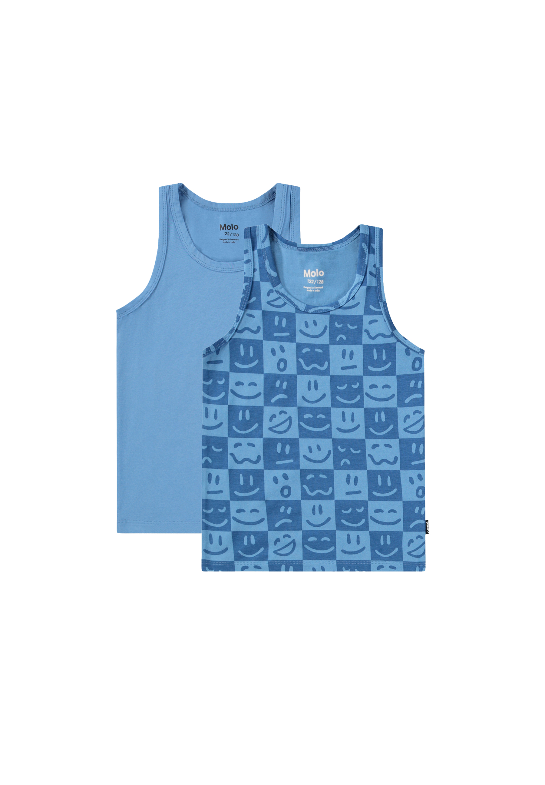 2-pack linnen i mjuk, ekologisk bomull med breda axelband och rund hals. Paketet innehåller ett blått och ett rutigt med roliga ansikten.