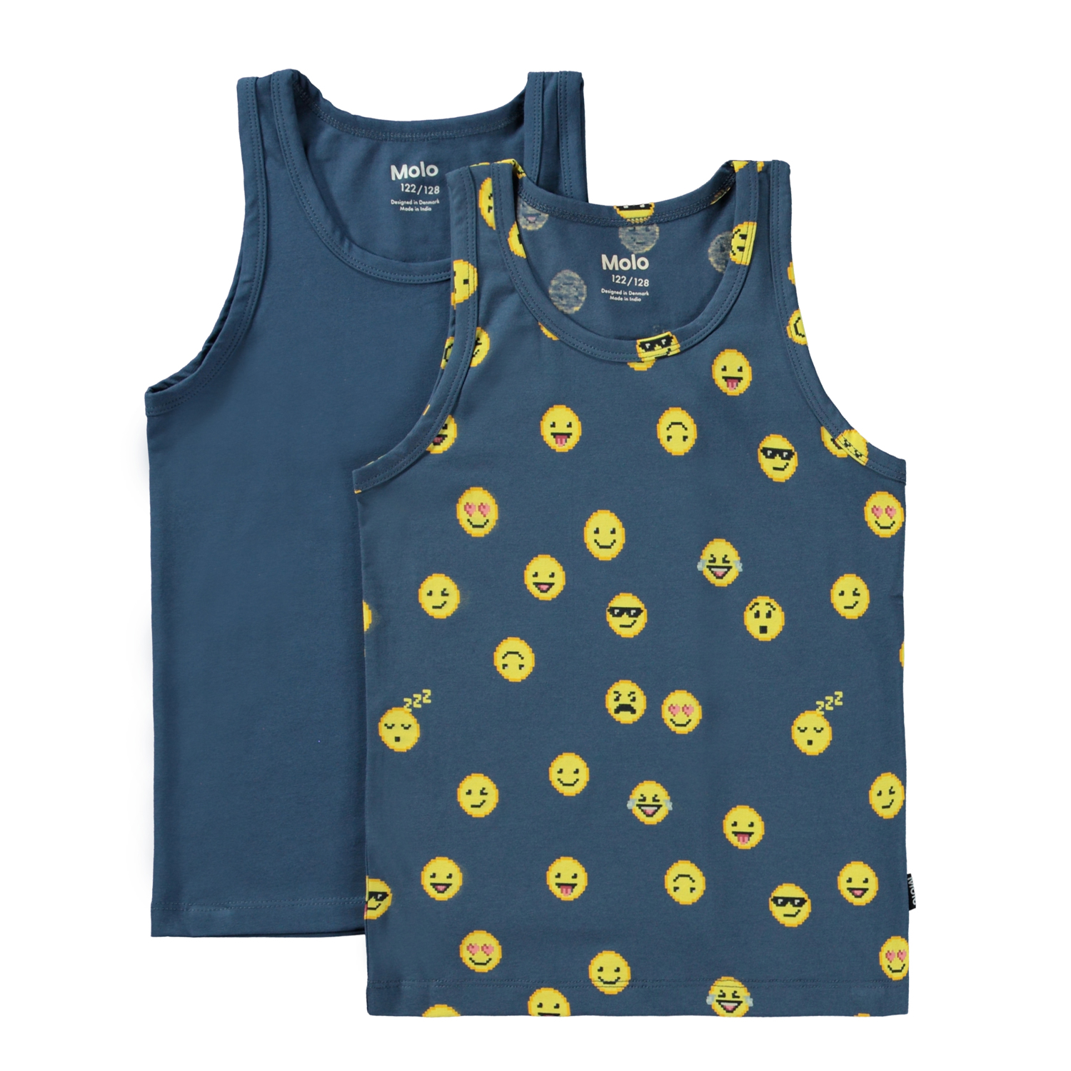 2-pack linen i ekologisk bomull. Paketet inkluderar ett marinblått linne och ett med roligt all-over emoji-tryck.