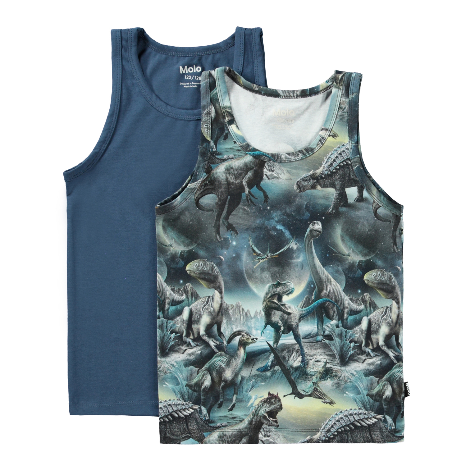 2-pack linnen i ekologisk bomull. Paketet inkluderar ett mörkblått linne och ett med livligt heltryck av dinosaurier.