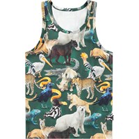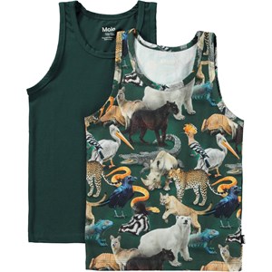 2-pack linne i ekologisk bomull. Paketet inkluderar ett mörkgrönt linne och ett med ett djurmönster över hela.