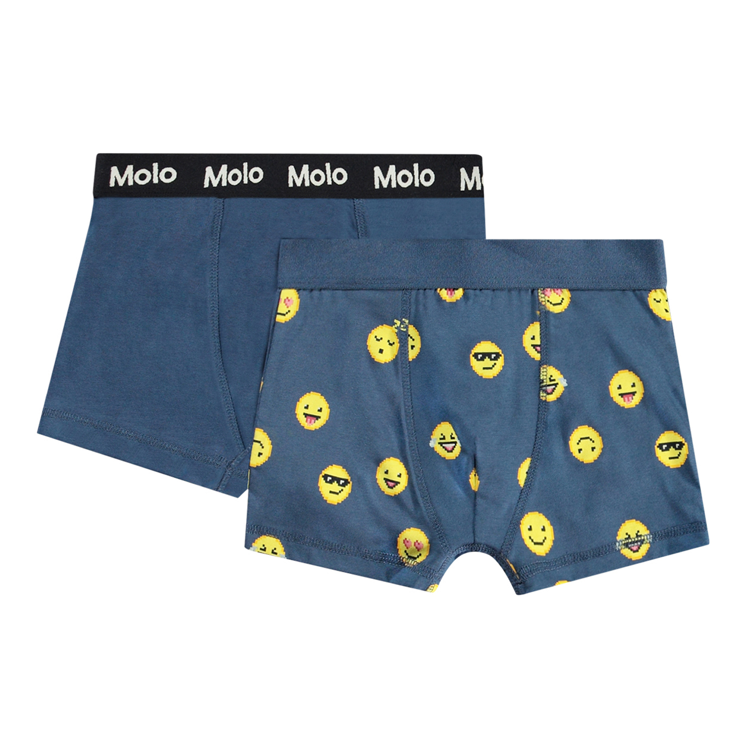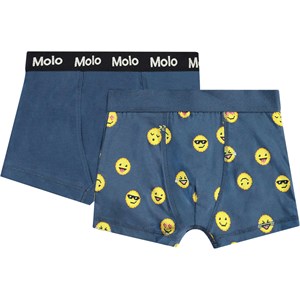 2-pack med boxershorts i ekologisk bomull. Paketet inkluderar ett par mörkblåa boxershorts och ett par med roligt all-over-tryck av emojis.