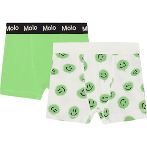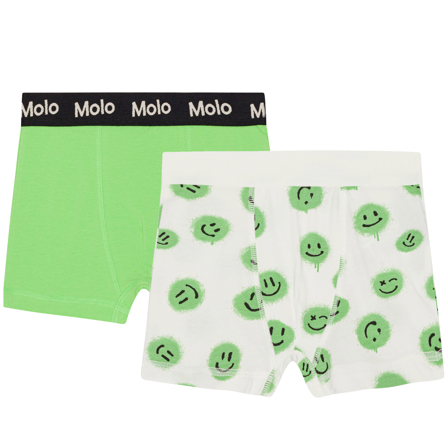 2-pack ekologiska kalsonger. Ett pa gröna och ett par vita med gröna smileys.