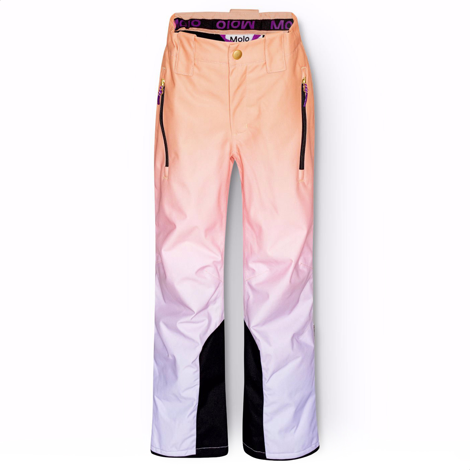 Vind- och vattentäta byxor i återvunnen polyester i orange, rosa och lila övergående färger. Byxorna har knapp- och dragkedjestängning, en justerbar invändig resår, bälteshällor för Molos hängslen (köps separat) och justerbara benslut med snölås och extra förstärkning mellan benen. Byxorna har fickor och en stor reflex på baksidan för att öka synligheten i trafiken. Dessutom är byxorna fodrade med fleece på utsatta områden och fodrade med 3M™ Thinsulate™ för att ge större rörlighet för barnet.