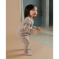 Ulmer är ett par beige babybyxor i 100% Merino ull med uppvik i benen. Byxorna har en rymlig passform med gummiband i midjan.