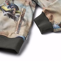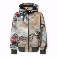 Vindtät och vattenavvisande softshelljacka i återvunnen polyester, med ett möntser av en motocrossförare i bruna toner. Jackan har en avtagbar huva, sidofickor, en vindklaff över dragkedjan och ribbade muddar vid ärmar, krage och nederkant för att effektivt hålla ute vinden.