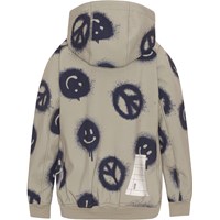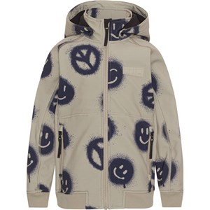 Cloudy er en sporty og vandtæt softshell jakke i beige med print af peace tegn og smileyer. Cloudy har aftagelig hætte, lynlås ned langs fronten, lommer i siden samt vindfang i ærmerne og elastisk kant i bunden. Molo's softshell jakker er et oplagt valg til overgangsperioderne, da ydermaterialet er vindtæt, vandtæt og åndbart. Produktet har en vandafvisende PFC-fri imprægnering (indeholder f.eks. ikke PFOS, PFOA og lignende). Vandsøjletryk: 8.000 mm. Åndbarhed: 5.000 g/m2/24t. Sømmene er ikke tapede.