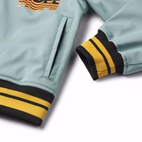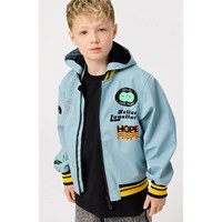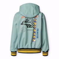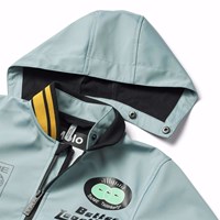 Blå vind- och vattenavvisande softshelljacka i återvunnen polyester, med små tryck av positiva uttalanden och meddelanden från kollektionens teman. Jackan har en avtagbar huva, sidofickor, en vindklaff över dragkedjan och ribbade muddar vid ärmar, krage och nederkant för att effektivt hålla ute vinden.