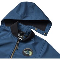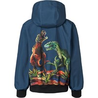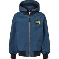 Blå vattenavvisande bomberjacka med avtagbar huva, mjukt fleecefoder och ribbade muddar vid ärmarna och nederkanten. Jackan har en dragkedja framtill, praktiska framfickor och ett coolt dinosauriemönster på ryggen samt ett broderat märke på bröstet. Perfekt för övergångsväder och aktiv lek.