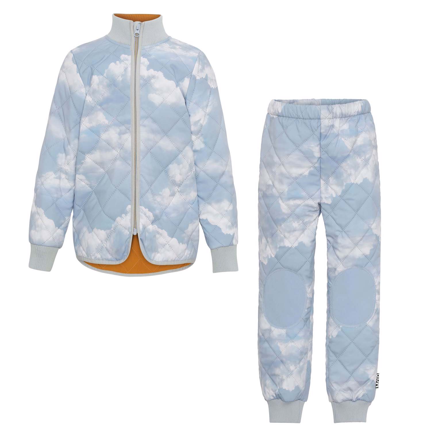 Hatton er et let isolerende termosæt et flot skyprint, som er designet med en indvendig kontrastfarve i gylden gul. Jakken har ribkanter ved hals- og ærmeafslutning og Molo's ikoniske refleksstjerne på ryggen, som sikrer synlighed i den mørke tid. Bukserne har elastik i taljen, ribafslutning ved benene og refleksstjerne bag på det ene ben. Derudover har bukserne forstærkninger i matchende farve på knæene og enden, hvilket gør bukserne ekstra holdbare til al slags leg.