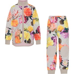 Hatton er et let isolerende termosæt i grå med stort blomster print. Jakken har ribkanter ved hals- og ærmeafslutning og Molo's ikoniske refleksstjerne på ryggen, som sikrer synlighed i den mørke tid. Bukserne har elastik i taljen, ribafslutning ved benene og refleksstjerne bag på det ene ben. Derudover har bukserne forstærkninger i matchende farve på knæene og enden, hvilket gør bukserne ekstra holdbare til al slags leg.