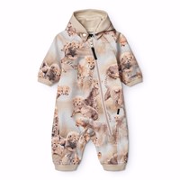 Blå och beige vind- och vattenavvisande softshell-dräkt för de små i återvunnen polyester med ett färgglatt mönster av gepardungar. Dräkten har invändigt fleecefoder, en stjärnformad reflex på ett ben, en avtagbar huva och tajta beige ribbade muddar vid ärmar, ben och krage för att hålla vinden ute. Den praktiska diagonala dragkedjan har hakskydd och fortsätter ner på ett ben, vilket gör den enkelt att ta på och av.