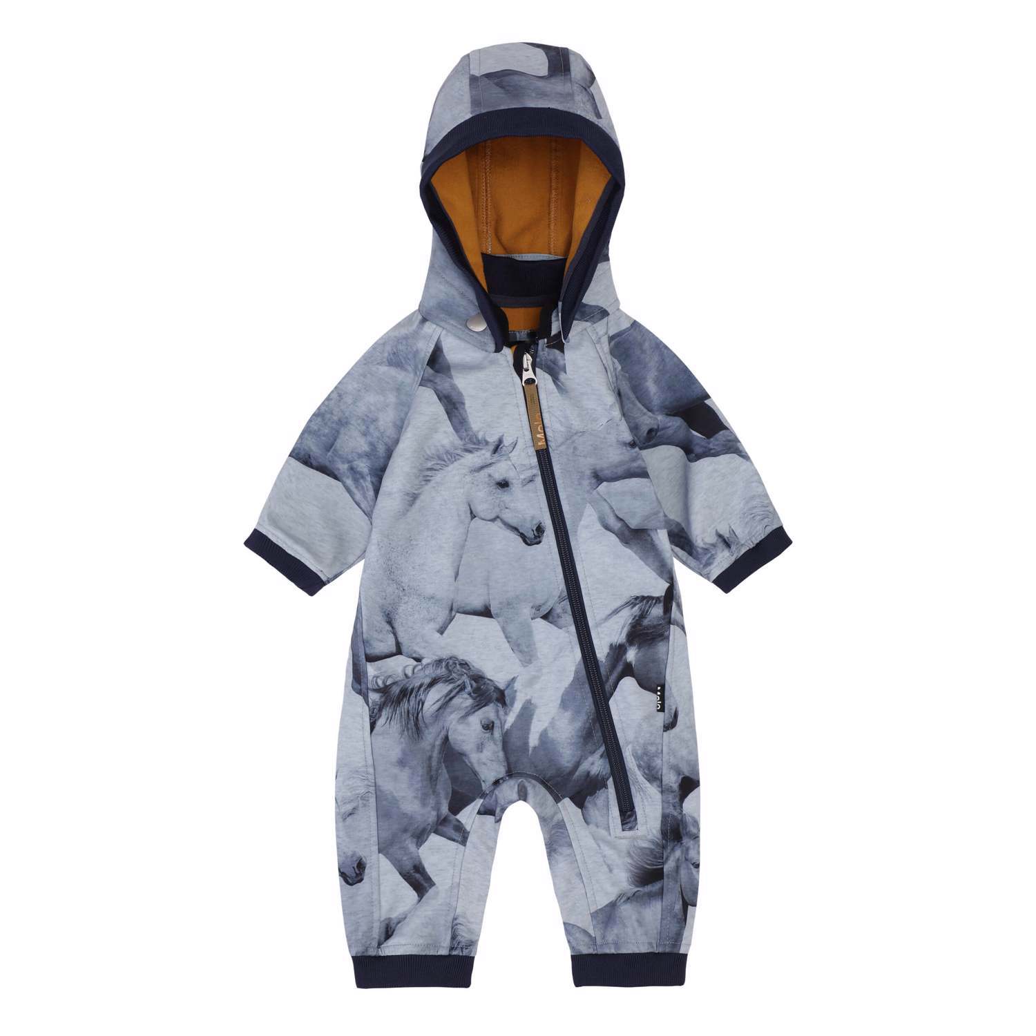 Hill är en funktionell och mjuk softshelldräkt till baby och små barn. Heldräkten är designad med ett fint hästmönster och kontrastfärg på insidan. Hill har avtagbar luva, mjuka ribbavslut, reflex baktill och en lång dragkedja framtill så att det är lätt att ta på dräkten. Molo´s softshelldräkt är det perfekta valet till förskola då dräkten är vindtät, vattentät och andas medan den invändiga fleecen är tillverkad av återvunnen polyester från plastflaskor. Denna produkt har en vattenavvisande PFC-fri impregnering (innehåller t.ex. inte PFOS, PFOA och liknande). Vattenpelare: 8.000mm. Andningsförmåga: 5.000 g/m2/24t. Sömmarna är inte tejpade.