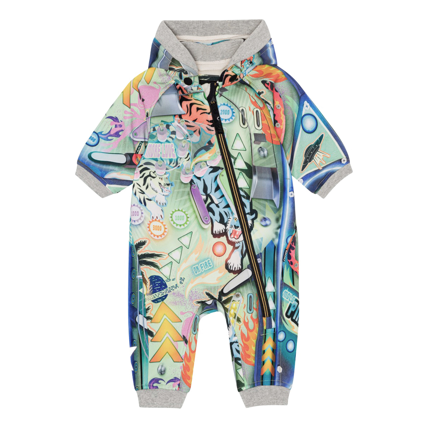 Funktionel softshell-dragt til babyer og mindre børn i delvist genanvendt polyester med et farverigt alloverprint, der er inspireret af en gammeldags pinball-maskine. Dragten har indvendig fleeceforing, en stjerneformet refleks på det ene ben, aftagelig hætte samt tætsluttende, grå ribkanter ved ærmer, ben og krave, der sikrer, at kold luft ikke trænger ind. Den praktiske, diagonale lynlås har hagebeskytter og fortsætter ned ad det ene ben, hvilket gør det nemt at tage dragten af og på.