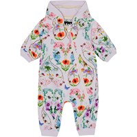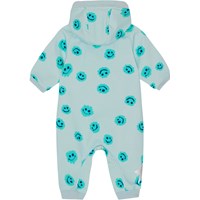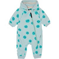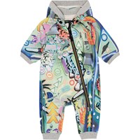 Funktionel, lyseblå softshell-dragt til babyer og mindre børn i delvist genanvendt polyester med alloverprint af smilende akvarel splash. Dragten har indvendig fleeceforing, aftagelig hætte samt tætsluttende, grå ribkanter ved ærmer, ben og krave, der sikrer, at kold luft ikke trænger ind. Den praktiske, diagonale lynlås har hagebeskytter og fortsætter ned ad det ene ben, hvilket gør det nemt at tage dragten af og på.