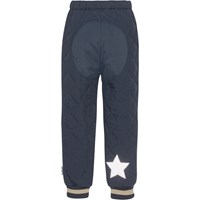 Hoti er et par let isolerende termobukser i mørkeblå. Bukserne har elastik i taljen, ribafslutning ved benene og Molo's ikoniske refleksstjerne bag på det ene ben, som sikrer synlighed i den mørke tid. Derudover har bukserne forstærkninger i matchende farve på knæene og enden, hvilket gør bukserne ekstra holdbare til al slags leg.