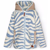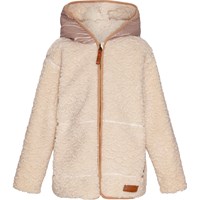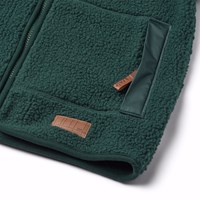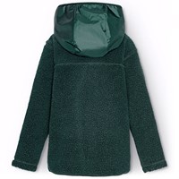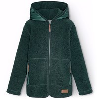 Grön fleecejacka med dragkedja framtill, en huva och stora fickor på framsidan. Fleecejackan är välisolerande och kan därför bäras ensam eller som ett extra lager under ytterkläder på de kallare dagarna.