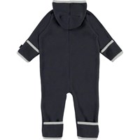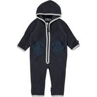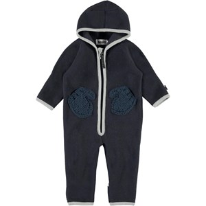 Udo är en blå baby fleecedräkt med blå kantband och stickade fickor, som liknar vantar. Dräkten har dragkedja och huva. Molos fleecedräkter värmer och isolerer. Använd den separat eller som ett extra lager under overallen vid riktigt kalla dagar.