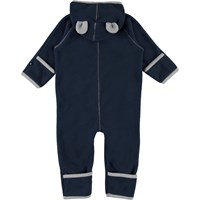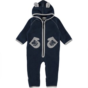Udo är en mörkblå fleeceoverall för baby med gråa stickade fickor, som ser ut som handskar med tassar på. Overallen har en dragkedja framtill och en luva med små öron på. Molos fleeceoveraller är värmande och isolerande. Använd den ensam eller som ett extra lager under overallen för extra värme. Denna fleecedräkt kommer att vara med fötter från storlek 56-74. Utan fötter från storlek 80-92.