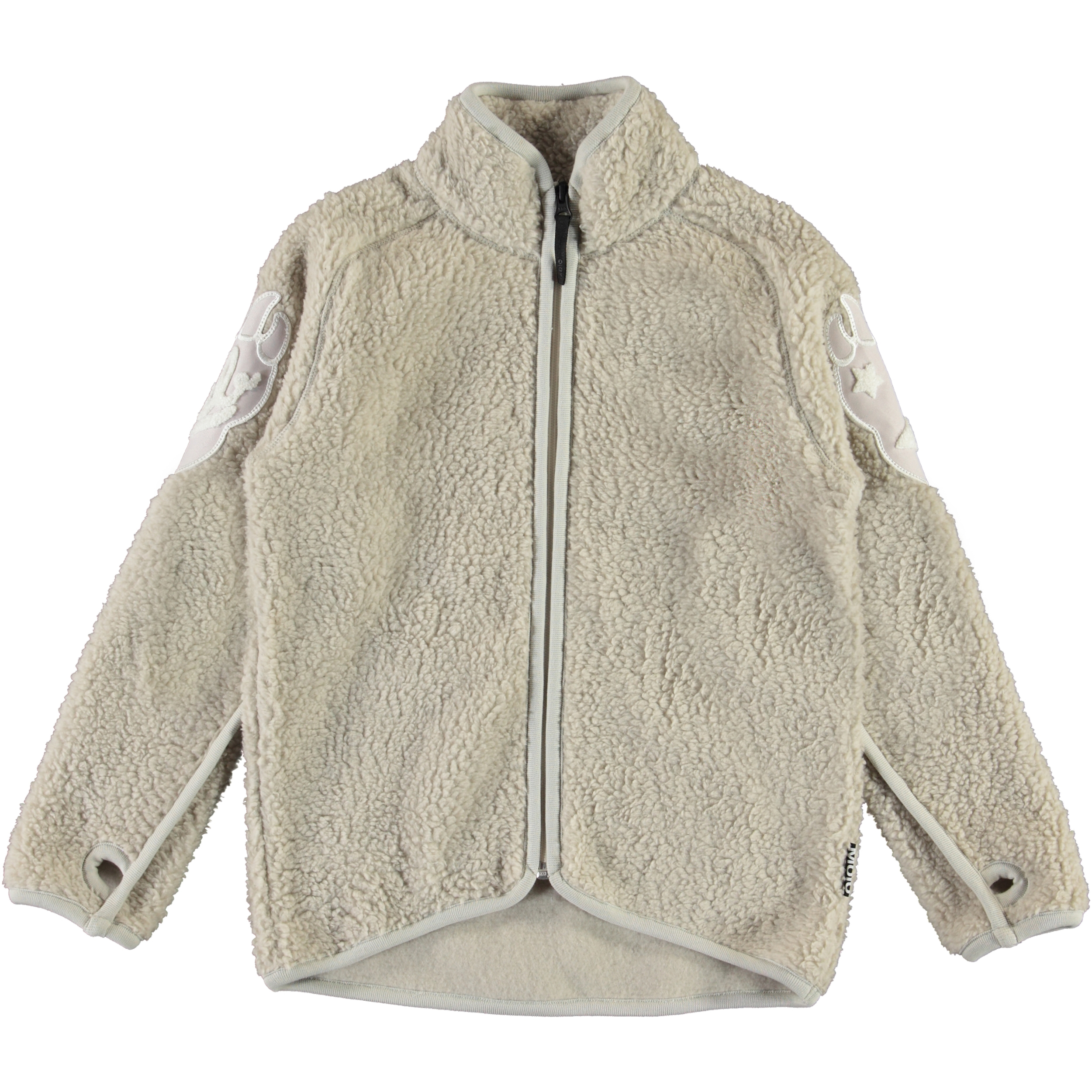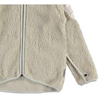 Ulan är en ljus teddy fleecejacka med dragkedja fram, tumhål, ett patch format som en björnloka på båda ärmarna samt kontrastfärgade detaljer. Molos teddy fleecetröja innehåller 70% naturlig bomull, som gör fleecetröjan mjuk och skön.