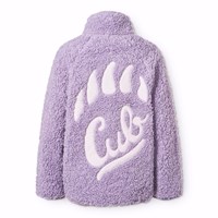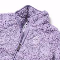 Lila fleecefodrad jacka i återvunnen polyester med en fin ryggdetalj i hållbar nylon. Jackan har ett mjukt bomullsfoder, lila ribbade kanter, hög krage, dragkedja och tumhål.