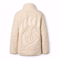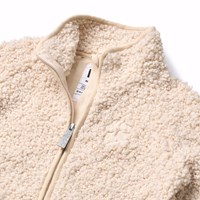 Off-white fleecefodrad jacka i återvunnen polyester med en fin ryggdetalj i slitstark nylon. Jackan har ett mjukt bomullsfoder, off-white ribbade kanter, hög krage, dragkedja och tumhål.