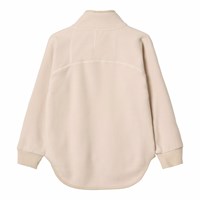 Off-white fleecejacka tillverkad av återvunnen polyester med matchande ribbade kanter. Jackan har en hög krage, dragkedja, en ficka framtill och är längre baktill. Den är mjuk, har en normal passform och fungerar bra både på egen hand eller som ett extra lager under en jacka.