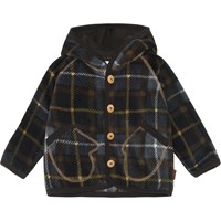 Uli är en brunrutig fleecejacka till baby. Jackan har ljusa sömmar, vantformade fickor fram och stängs med knappar.