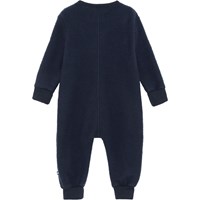 Umar är en blå babydräkt i 100% Merino ull med knappar framtill. Dräkten har rymlig passform och uppvik på både ärmar och ben.