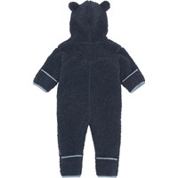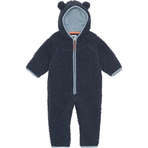 Mørkeblå fleecedragt med lyseblå kanter, praktisk lynlåslukning og hætte med påsyede små ører. Fleecedragten varmer og virker isolerende, og den kan derfor bruges alene eller som et ekstra lag under flyverdragten på de koldeste dage. Denne style leveres med fødder fra størrelse 56-74 og uden fødder fra størrelse 80-92.
