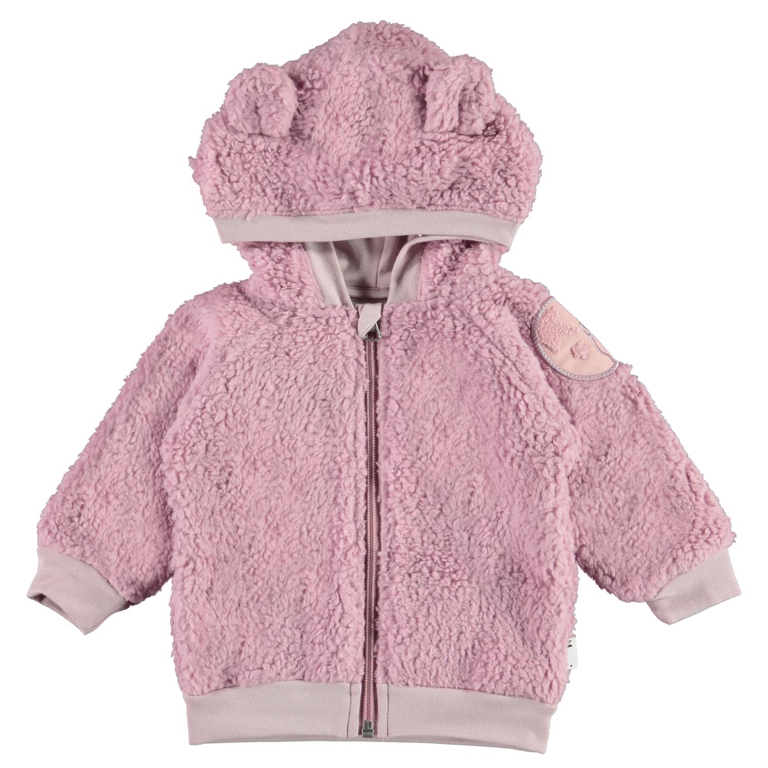 Ummi är en mjuk fleecejacka i rosa. Ummi har påsydda små öron på luvan, samt ribb vid luvans kant, ärmslut och nederkant. Använd den som mellanlager eller som den är, då den isolerar och värmer skönt.