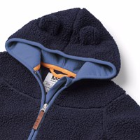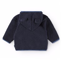 Mörkblå fleecejacka för baby och småbarn. Jackan har en praktisk dragkedja, en huva med små teddybjörnsöron och ljusgröna kanter. Fleecejackan är isolerande och kan därför användas på egen hand eller som ett extra lager under ytterkläder på kalla dagar.
