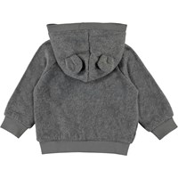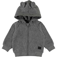 Ummi är en mjuk baby fleecejacka i grå. Ummi har huva med fastsatta små öron, samt ribb vid huvans kant, ärmslut och nederkant. Använd den som ett mellanlager eller som ett extra värmande lager under en annan jacka.