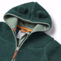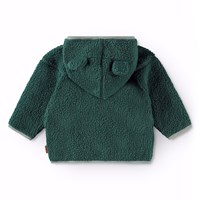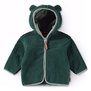 Mörkgrön fleecejacka för baby och småbarn. Jackan har en praktisk dragkedja, en huva med små teddybjörnsöron och ljusgröna kanter. Fleecejackan är isolerande och kan därför användas på egen hand eller som ett extra lager under ytterkläder på kalla dagar.