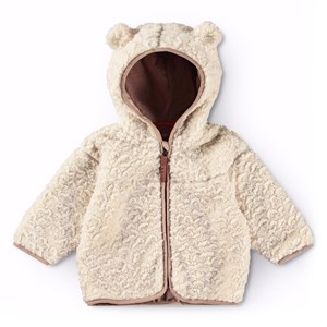 Off-white fleecejacka för baby och småbarn. Jackan har en praktisk dragkedja, en huva med små teddybjörnsöron och ljusgröna kanter. Fleecejackan är isolerande och kan därför användas på egen hand eller som ett extra lager under ytterkläder på kalla dagar.