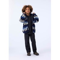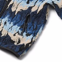 Mjuk fleecefodrad jacka tillverkad av återvunnen polyester med matchande ribbade kanter och fodrad med mjuk bomull. Jackan har en hög krage, dragkedja, två framfickor med dragkedjor, en normal passform och fungerar bra både på egen hand eller som ett extra lager under en jacka. Jackans väv ser ut som lågor i blå och beige nyanser.