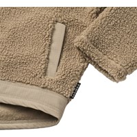 Sandfärgad fleecejacka i återvunnen polyester med framfickor och hållbara detaljer. Jackan har en lös passform, hög krage, dragkedja med hakskydd och är längre bak.