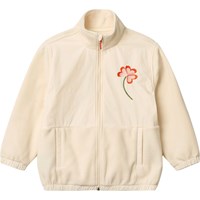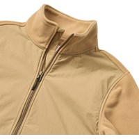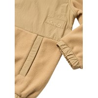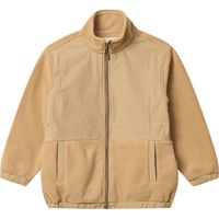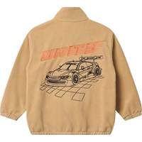 Sandfärgad fleecejacka med mjuk bas och slätt, vind- och vattenavvisande tyg ovanpå. Jackan har en dragkedja med en svart detalj, hög krage, resår vid ärmarna och nederkanten samt sidofickor. På baksidan finns ett broderat motiv med en racerbil och UNITY-logotyp i kontrasterande färger. En varm och bekväm jacka för vardagsbruk.